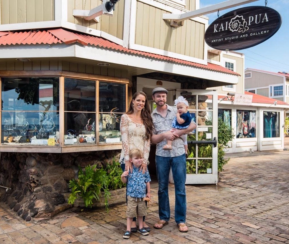 Anna Keay Lindquist was born and raised on the coast in Northern California. While pursuing an art degree from Humboldt State University, Anna relished in many mediums including jewelry, ceramics, and painting. For the first 15 years of her art career, she focused on oil paintings of large tropical flowers from her sister’s flower farm on Maui. This led to her moving to Maui in 2004 where she lived on the flower farm, enjoying the rain forest, and painting her subjects. Along the way, Anna met another artist, glass sculptor John Lindquist, and they were soon married and opened Kai Pua Gallery. Once having kids, Anna started painted less, and she started to gravitate back to her jewelry making passion. Now Anna paints part time and her main focus is on her gorgeous ocean themed jewelry using endemic Hawaiian sunrise shells, pearls, geodes and gemstones.