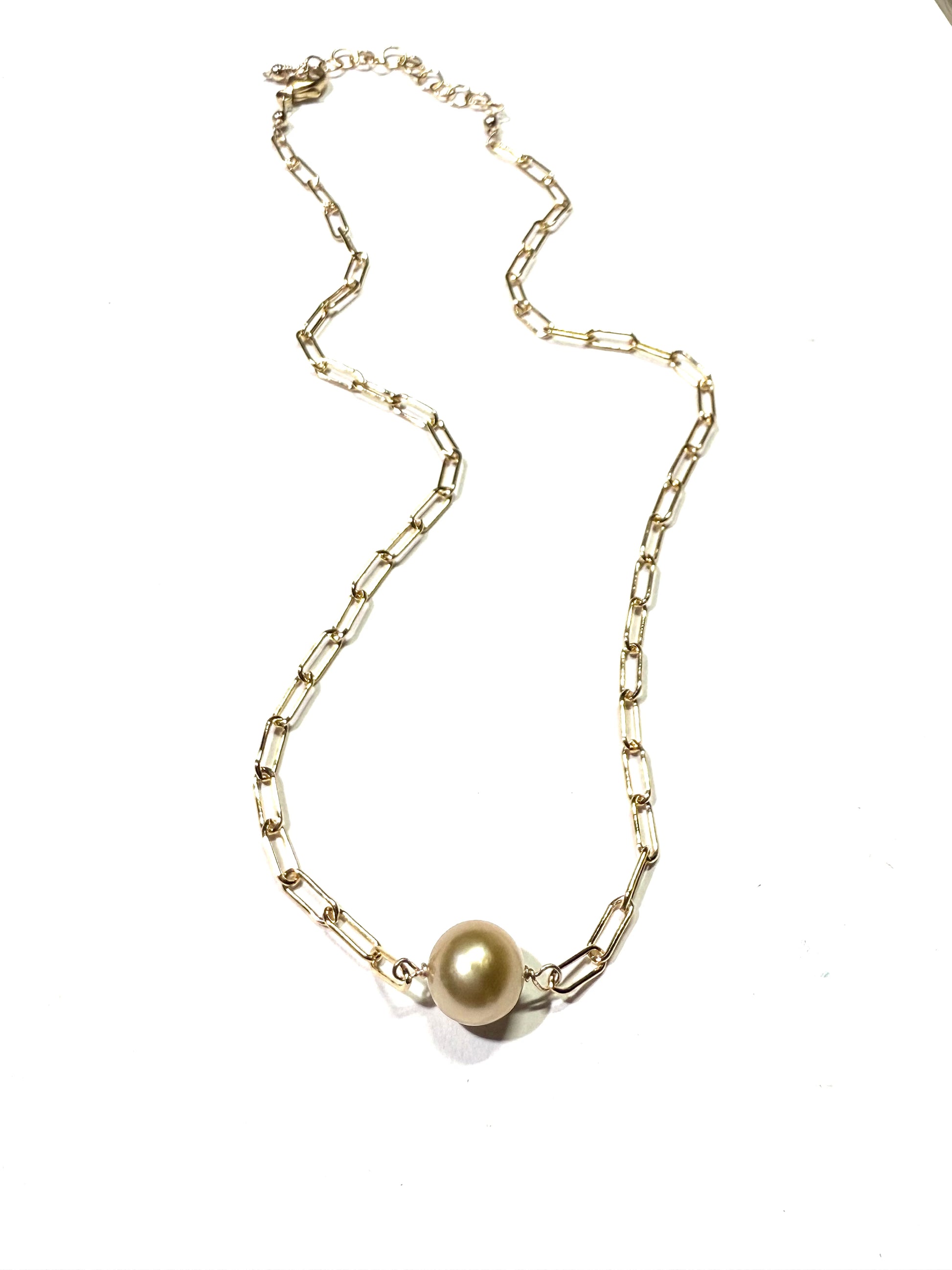 This 10mm golden south sea pearl necklace is made to order. Each pearl is hand chosen by me with gorgeous color and luster. The 14k gold filled paperclip chain is adjustable between 16”-18”.