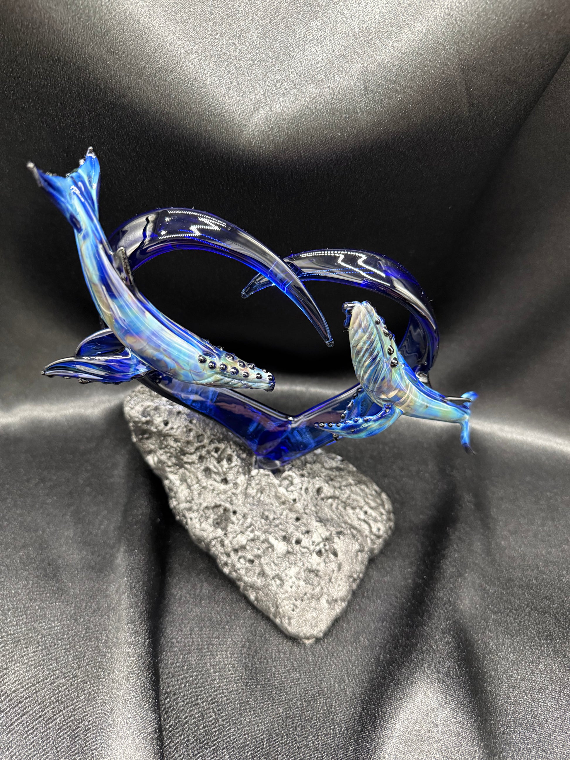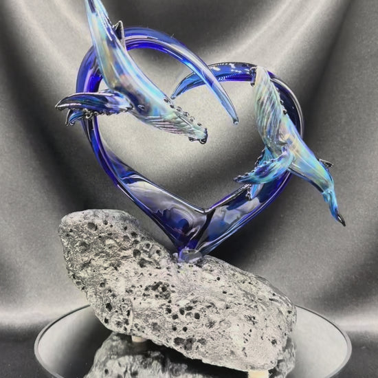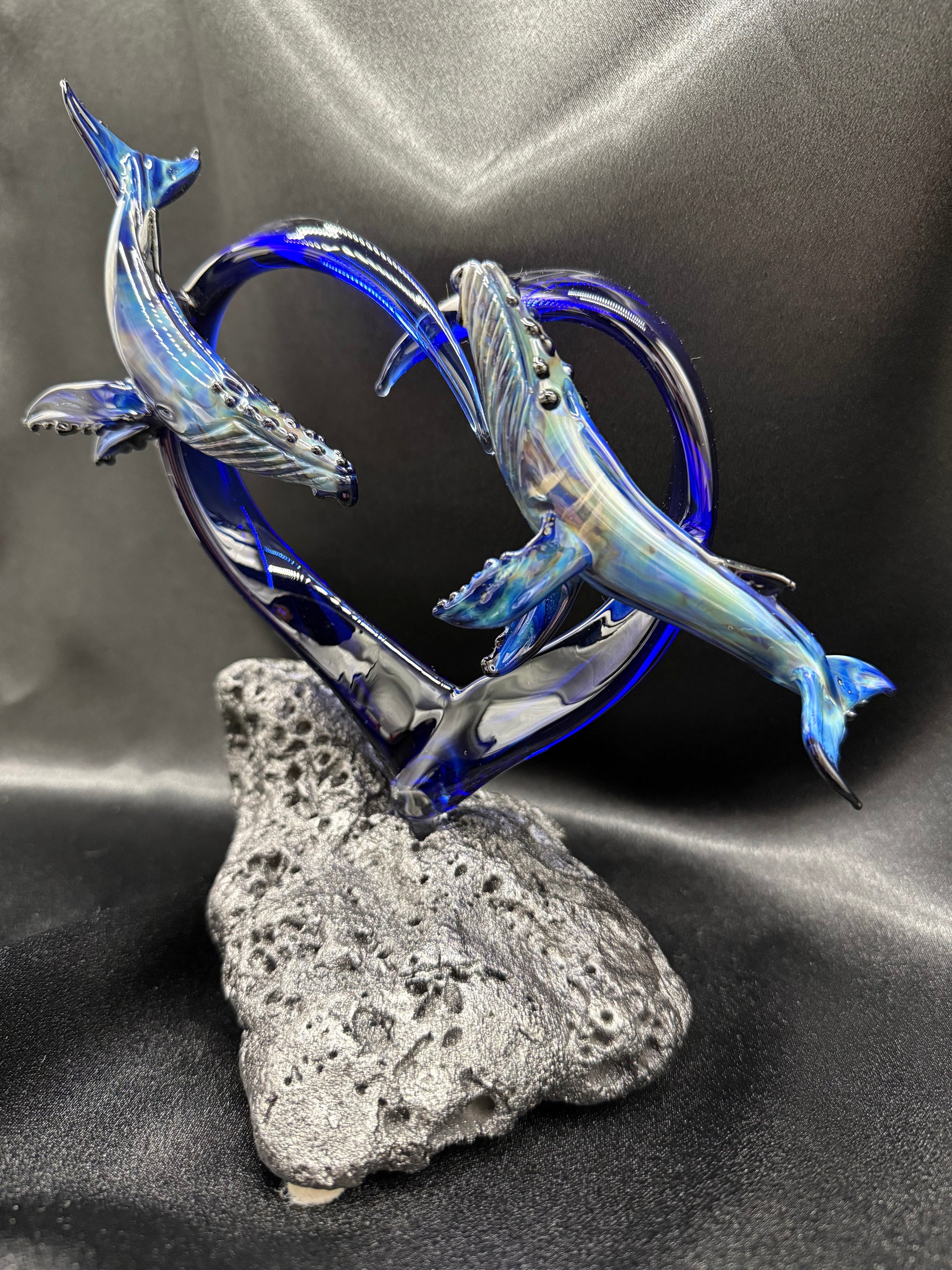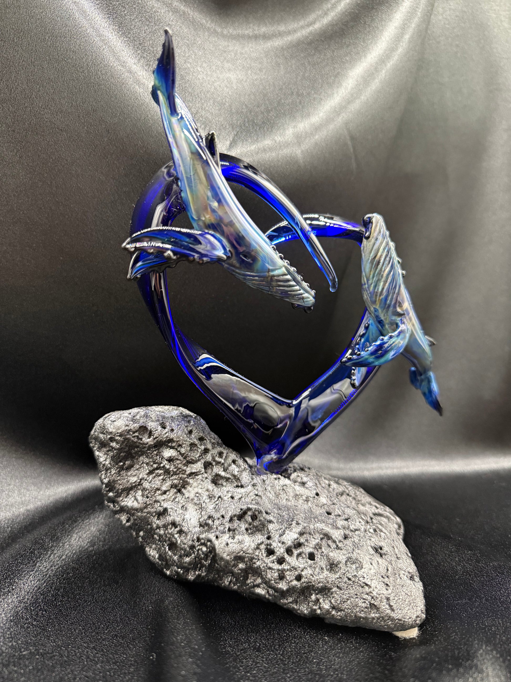 This elegant sculpture by master flameworker Sean Price represents the love that humpback whales show each other. It features a swimming humpback and her escort that is breaching to gain her favor. They flow through cobalt blue waves that form a heart. It is mounted in a cast base that represents Hawaiian lava rock.