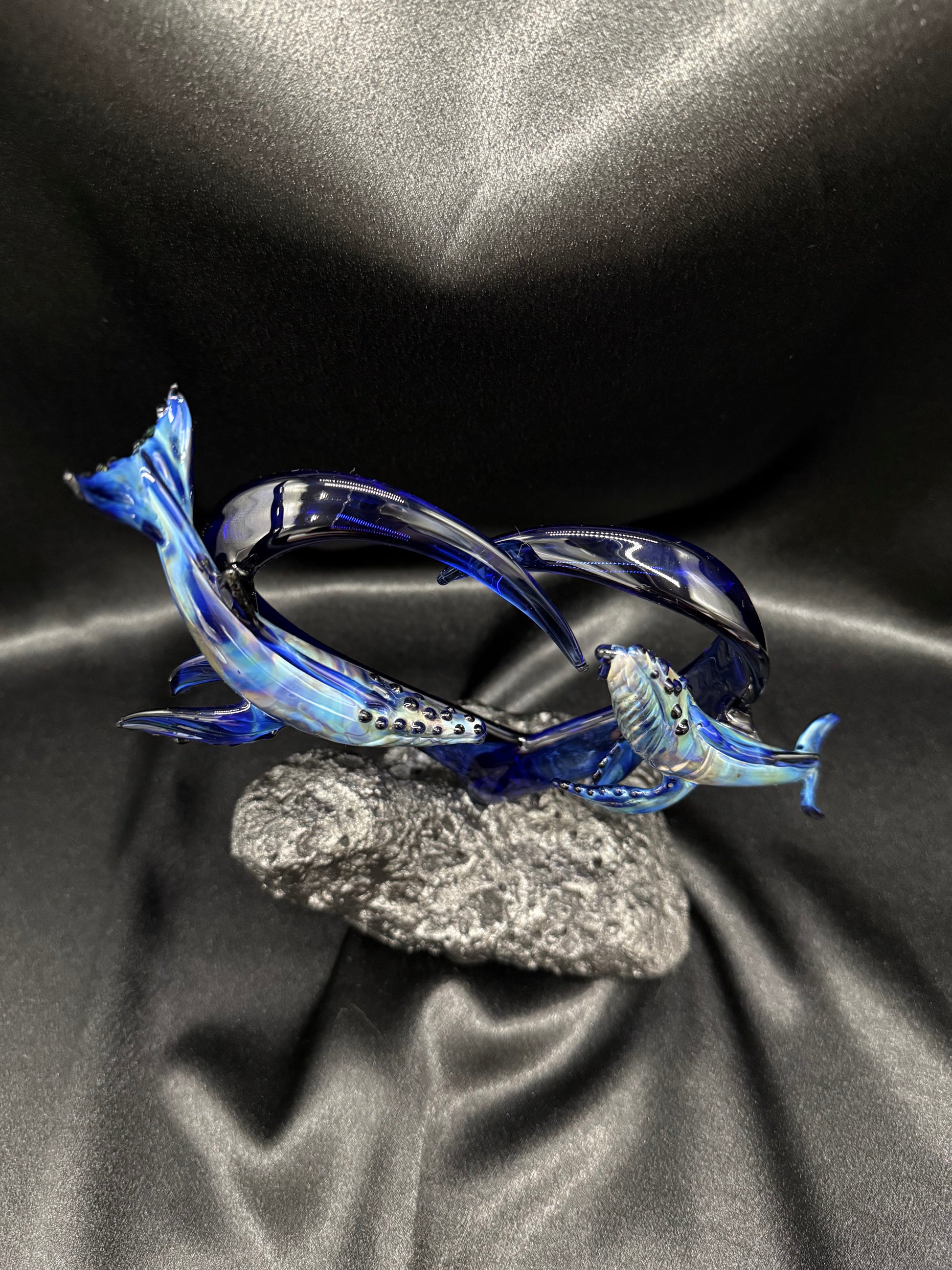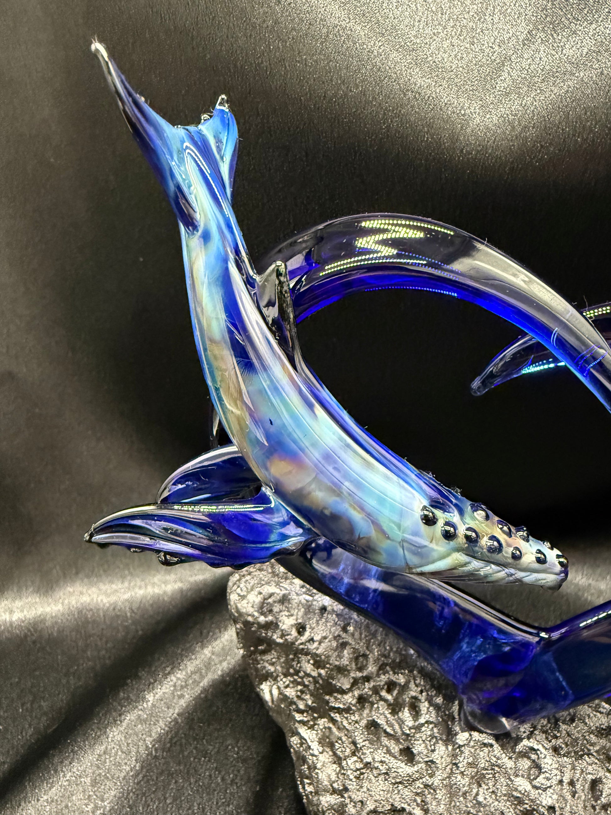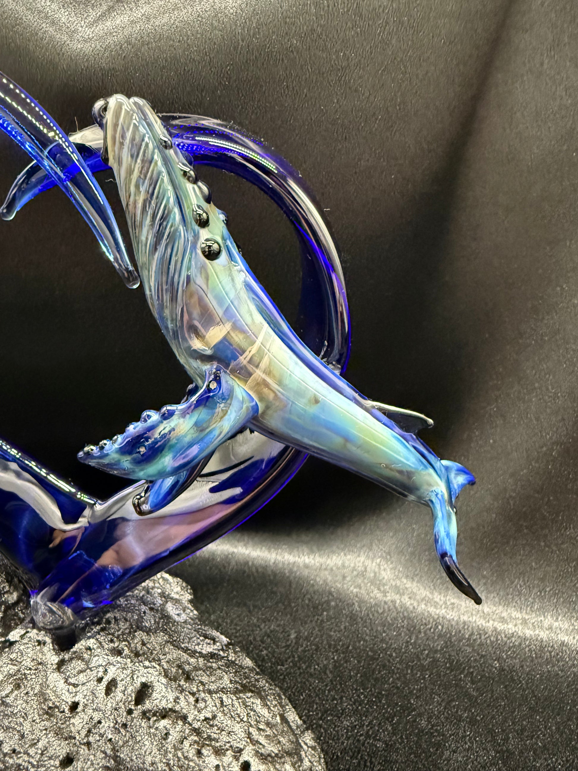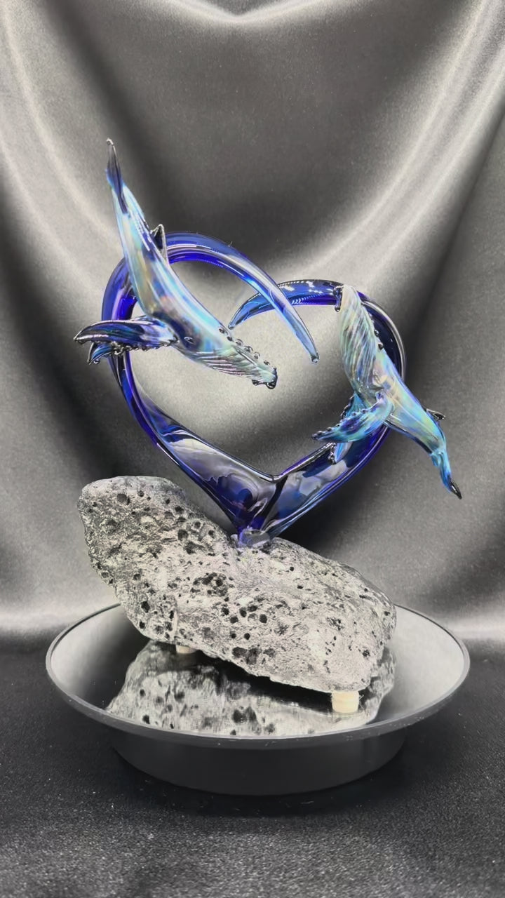 This elegant sculpture by master flameworker Sean Price represents the love that humpback whales show each other. It features a swimming humpback and her escort that is breaching to gain her favor. They flow through cobalt blue waves that form a heart. It is mounted in a cast base that represents Hawaiian lava rock.